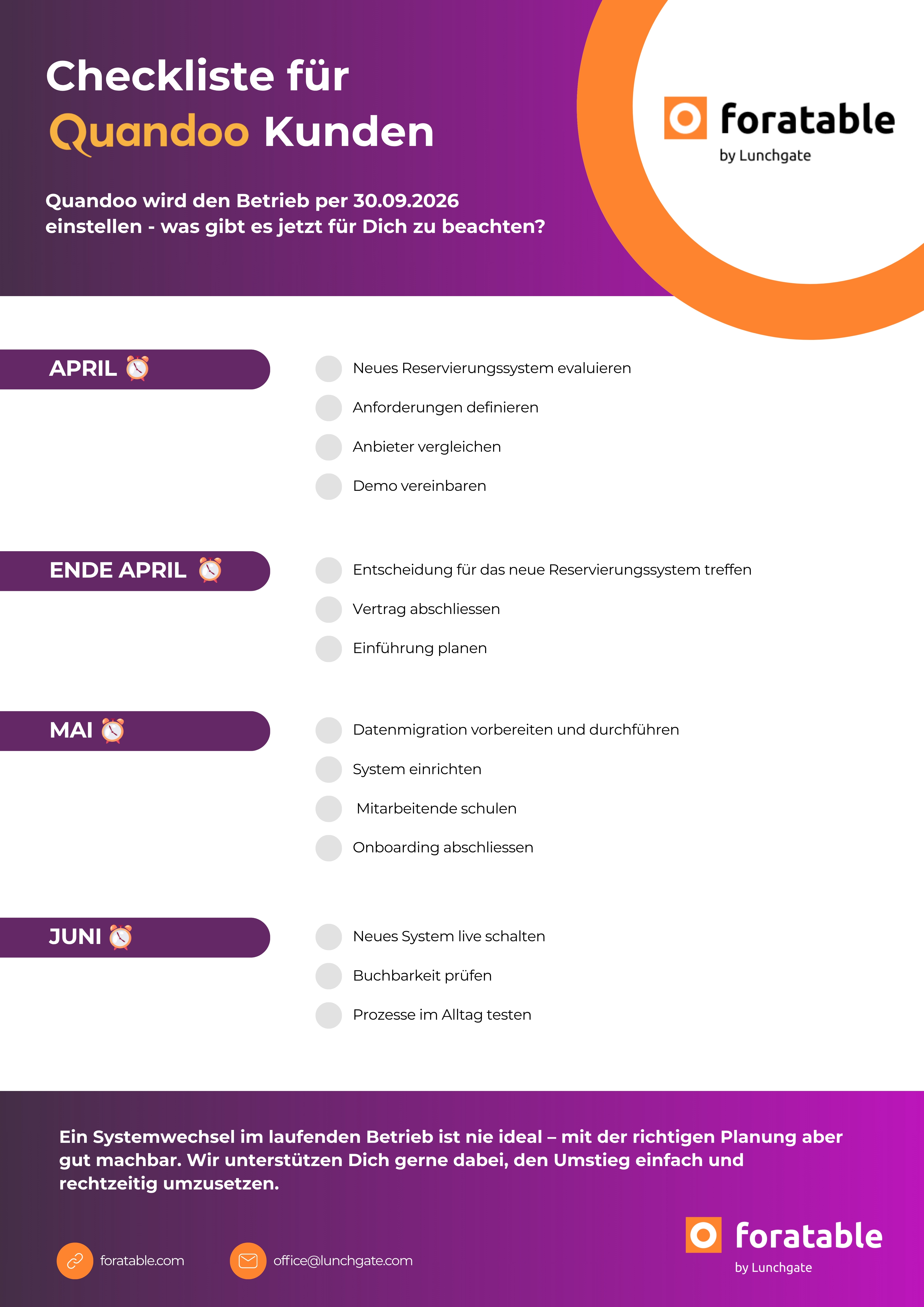 Auch wenn Quandoo noch einige Monate verfügbar bleibt, ist jetzt der richtige Zeitpunkt, um den Wechsel vorzubereiten. Wer früh plant, stellt sicher, dass der Reservationsbetrieb ohne Unterbruch weiterläuft.