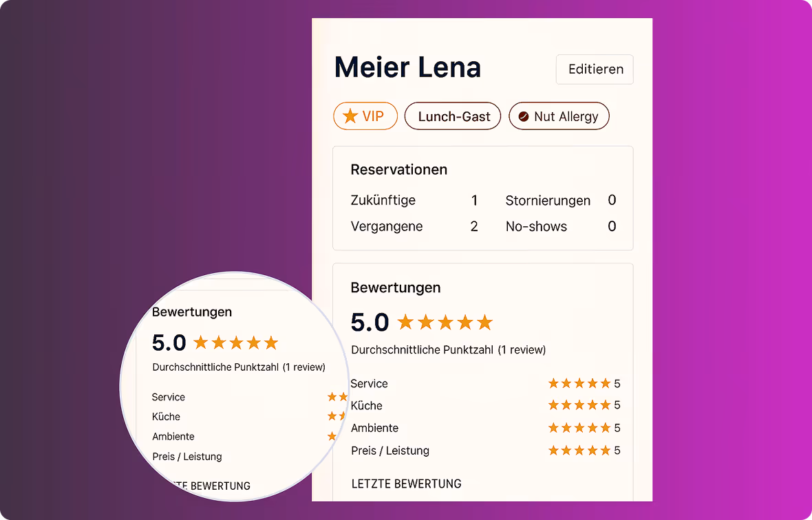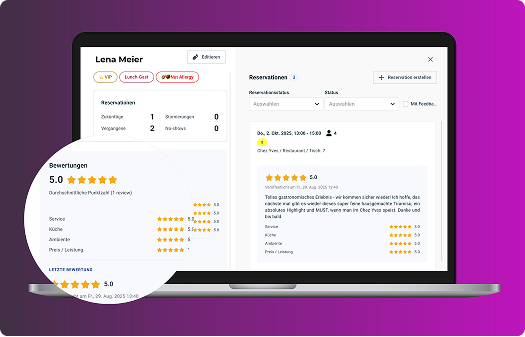 Alle Bewertungen deines Gastes sind direkt in seinem Gästeprofil im foratable CRM sichtbar. So kann dein Team gezielt auf frühere Erfahrungen, Wünsche und Kritik eingehen und jeden Gast noch persönlicher betreuen.