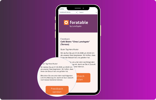 foratable fordert deine Gäste nach ihrem Besuch automatisch per E-Mail dazu auf, ihr Erlebnis zu bewerten. So sammelst du ohne zusätzlichen Aufwand wertvolles Feedback zum richtigen Zeitpunkt.